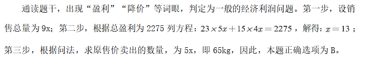 【例 1】商店购入一批某种水果,如按定价销售,每千克盈利 23 元。销售总量的 5/9后,每千克降价 8 元卖出剩余部分,销售这批水果共盈利 2275 元。问按原定售价卖出了多少千克水果?