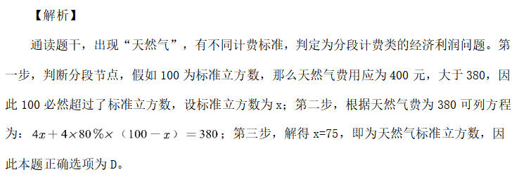 【例 2】某地居民生活使用天然气每月标准立方数的基本价格为 4 元/立方,若每月使用天然气超过标准立方数,超出部分按其基本价格的 80%收费。某用户 2 月份使用天然气 100立方,共交天然气费 380 元,则该市每月使用天然气标准立方数为多少立方?
