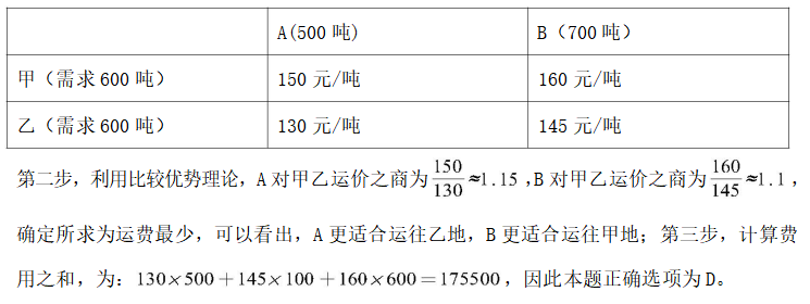 【例 3】某公司需要将 A、 B 两地的同一产品运往甲、 乙两个工厂。已知 A、 B 两地分别有该产品 500 吨和 700 吨, 甲、 乙两个工厂对该产品的需求量均为 600 吨, 若从A 地出发运往甲、 乙两个工厂的运价分别为 150 元/吨和 130 元/吨, 从 B 地出发的运价分别为 160 元/吨和 145 元/吨, 则完成此项运输任务的运费最少是: