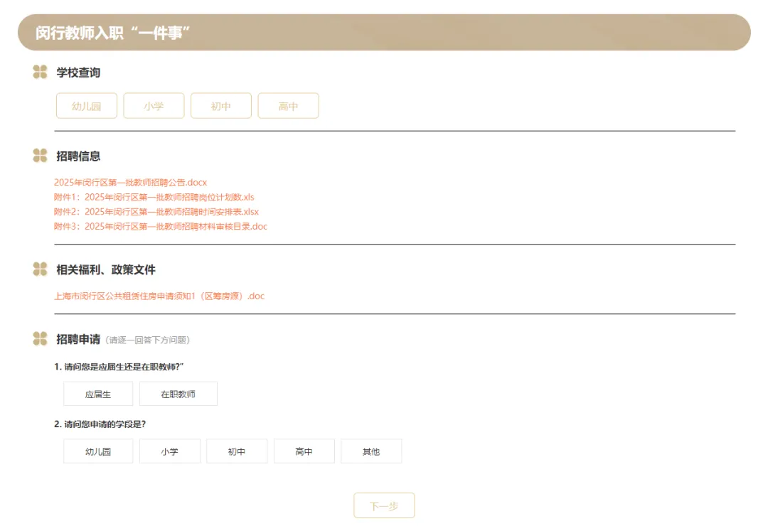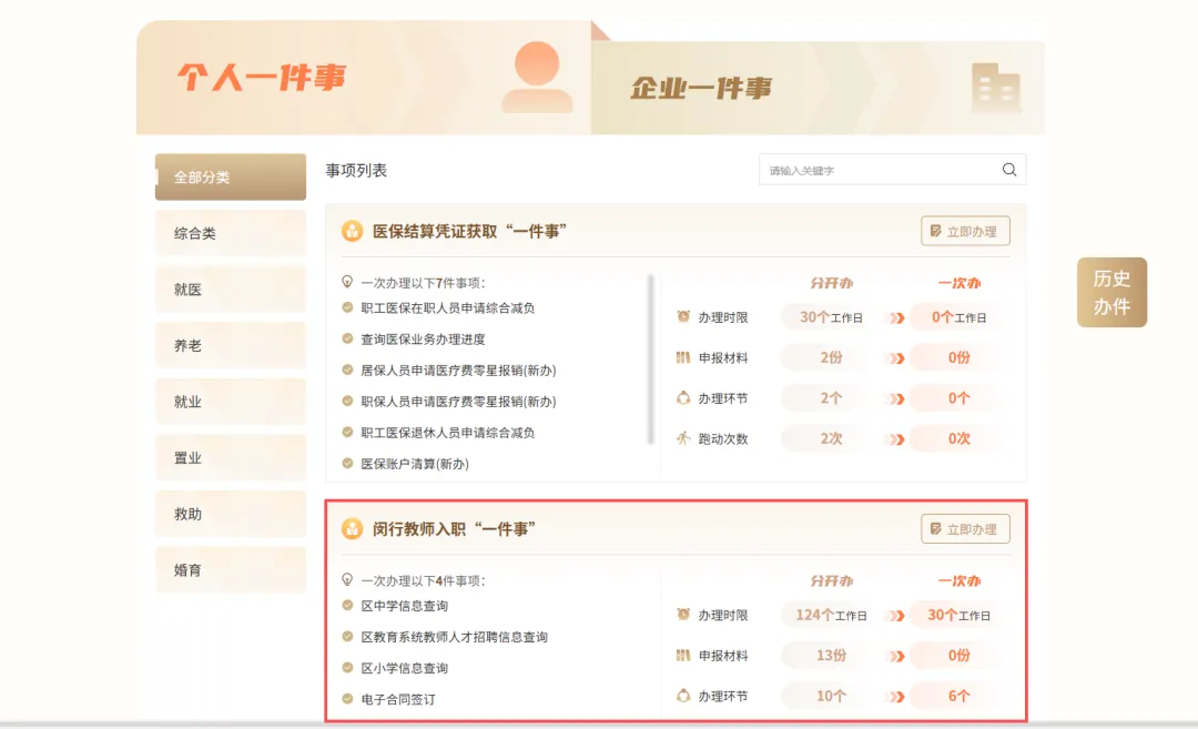 点击网址,进入“闵行区一件事”首页,点击“闵行教师入职”一件事。