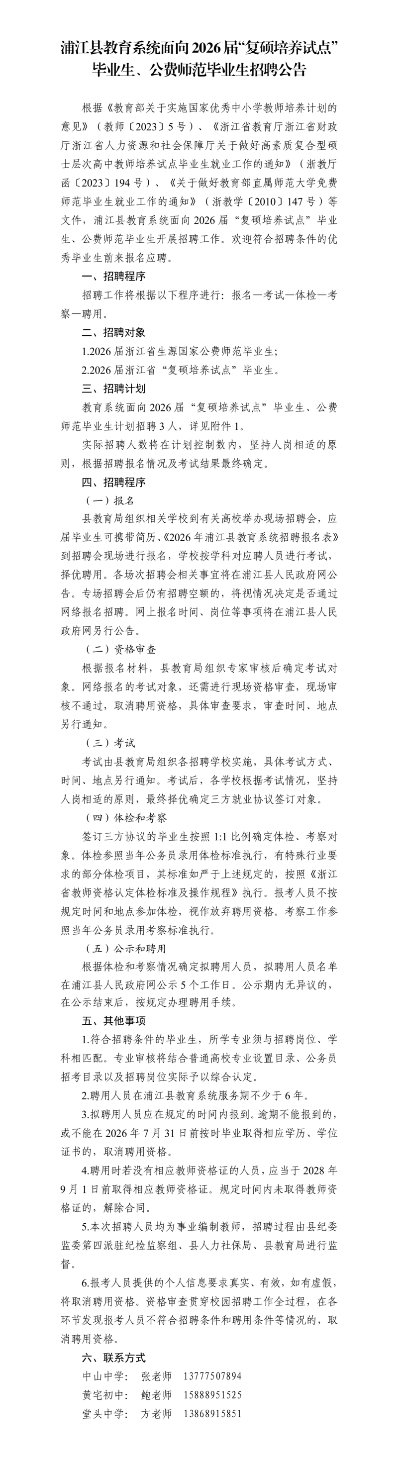 附件1:1.浦江县教育系统面向2026届“复硕培养试点”毕业生、公费师范毕业生招聘计划.xlsx