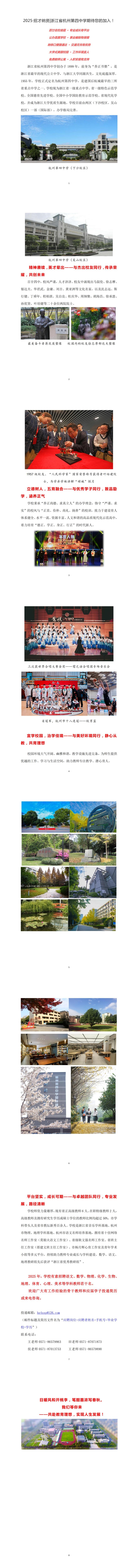 杭州第四中学前身“养正书塾”,创办于1899年,是浙江省最早的现代公立中学(与浙江大学同出一源)。1955年正式定名杭州第四中学,是建国后杭城最早的三所省重点中学之一。“严谨、求实”的校风、“正直、俭朴、尚礼、扬善”的校训、“养正尚德、求真立人”的办学理念,在全省中等教育领域影响广泛。学校为杭州市唯一的全国德育先进学校、全国体育示范学校、省一级重点中学、省一级特色示范学校、省现代化学校、省级文明单位、省千校结好特色学校、市人民满意学校、市首批教育国际化示范校。 学校秉承百年四中“养正”育人传统,以“塑造学生的发展品质,打造培育品质学生的一流高中”为学校发展愿景。2004年成立杭州四中教育集团,2013年,形成包括下沙校区、吴山校区、国际部的“一校两区一部”多元办学格局,2021年领办杭四中江东学校,开启集团化办学新篇章。 名校汇聚名师,名师泽被桃李。学校是物理、地理、音乐省市学科基地,杭州市语文名师培养基地。师资力量雄厚,现有在校学生共3900余人,教职员工341人,现有省正高级教师5人、特级教师1人,高级教师比例近50%,市学科带头人和省市教坛新秀120人。 教改彰显品质,品质回馈社会。学校积极顺应美好教育变革,形成“文化养正”和“科技求真”两大办学特色,拥有20多门省市精品课程的养正课程体系助力学生全面而个性化发展。把握新课程、新高考,精细化过程管理,小班化选考教学,高考成绩始终保持高位增量,新高考以来不断跨越新高度,跻身新行列。 活动发挥特长,特长铸就特色。学校为省体育、艺术特色学校,是浙大、浙江理工大学高水平运动员培养基地。校园融汇人文,人文助力成长。 学校是杭州市绿色学校,春有花、夏有阴、秋有果、冬有绿。校园开阔大气、环境幽美、人文和谐,是杭州市设施最完善的现代化寄宿制高中之一。校园内有目前市区高中唯一的生态种植园,是休闲和科学实践得天独厚的场所。