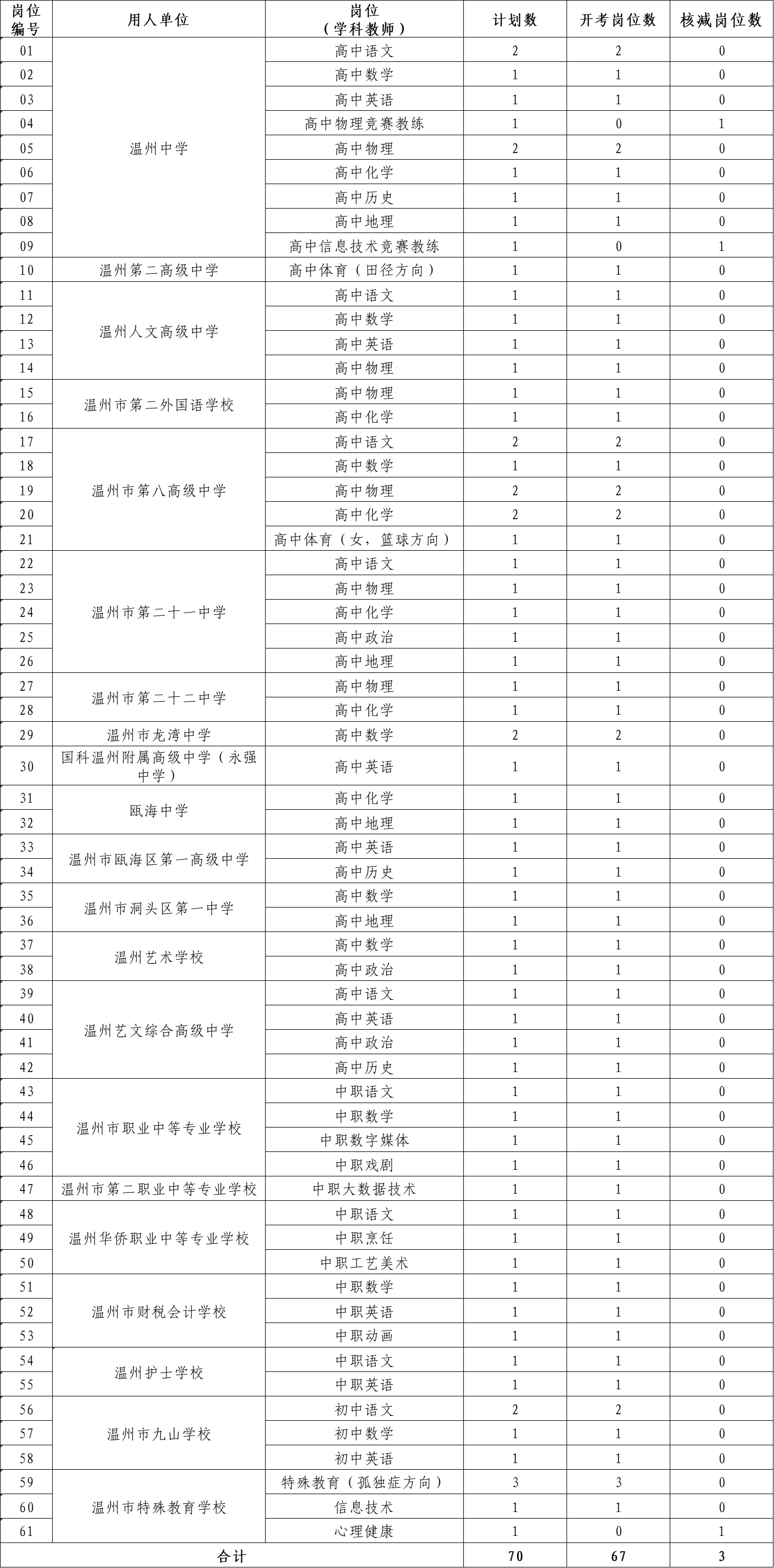根据《温州市教育局直属公办学校2026年公开选聘优秀高校毕业生公告(温州专场)》,计划岗位数70个,开考岗位数67个,核减(取消)岗位数3个。现将具体情况公告如下:
