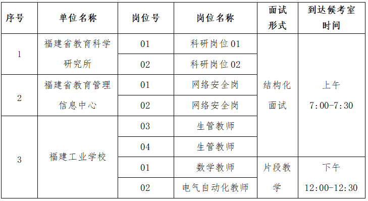 1.片段教学面试每位考生准备时间为30分钟(含撰写教案),由考点统一提供教材,所用教材具体见福建工业学校网站通知。片段教学和结构化面试考生面试时间均为15分钟。