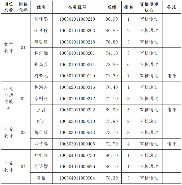 四、福建工业学校通过资格复审拟参加面试的考生名单
