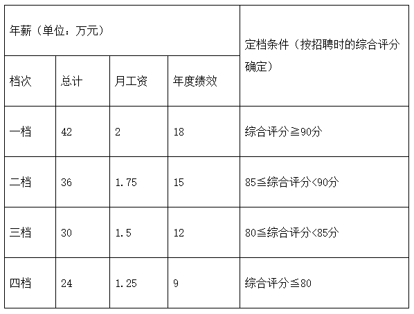 特聘骨干教师年薪为24万至42万元人民币(含五险一金,含税,含单位部分和个人部分),分为四档,在入职时根据招聘的综合评分确定年薪档次,按“月工资+年度绩效”形式发放,其中:月工资按每年12个月计发,年度绩效在学年末(每年的7-8月)经考核后发放。“聘用人员超过法定退休年龄的:如已办理退休并领取养老待遇人员,单位年薪含为其购买特定人员单项工伤保险的费用;对未办理退休和领取养老待遇人员,单位年薪含为其在聘期内缴交“五险一金”至其达到符合享受养老待遇条件止的费用,办理退休后即调整为仅为其购买特定人员单项工伤保险。具体如下: