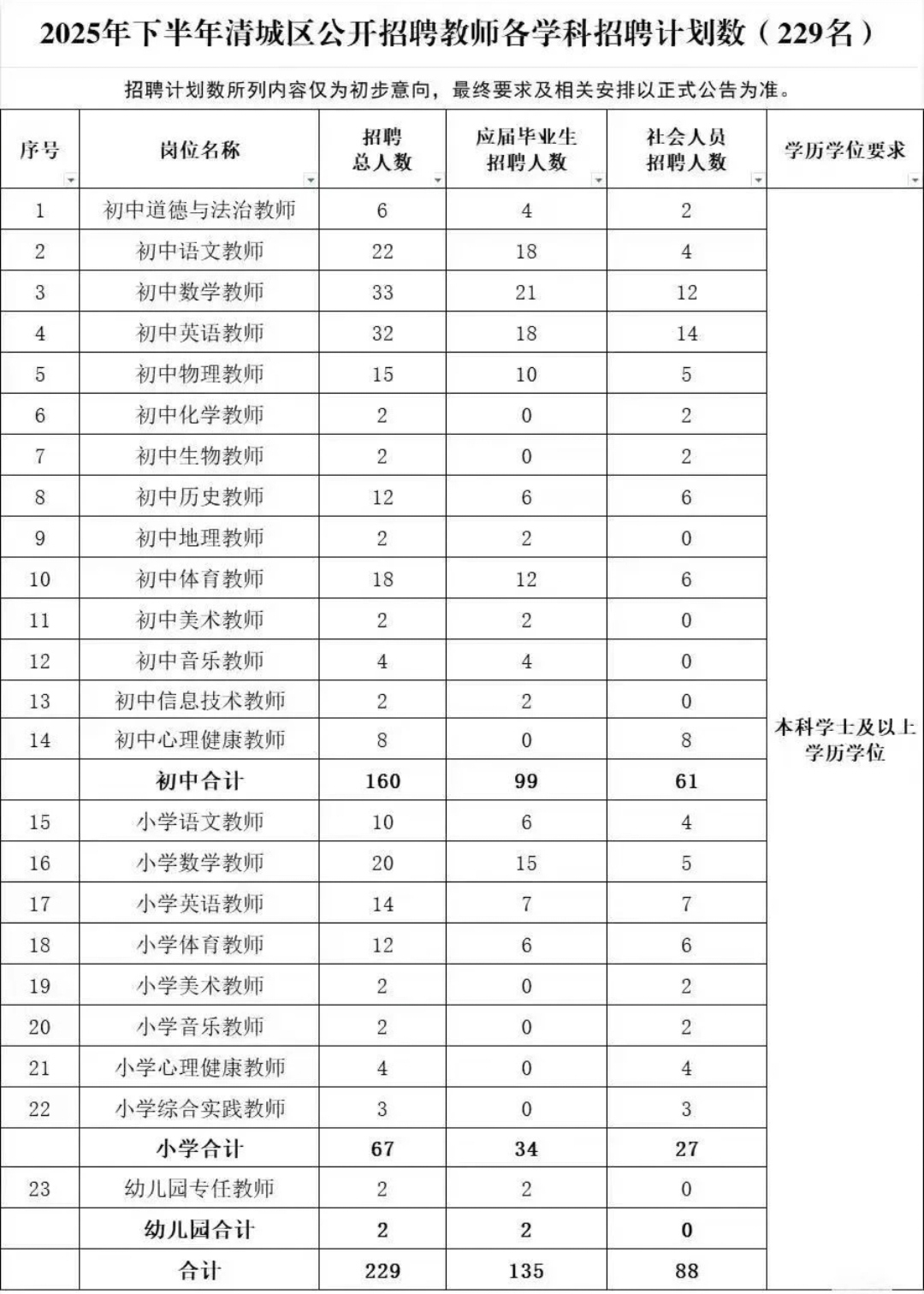 附件:2025年下半年清城区公开招聘教师各学科招聘计划数(229名)