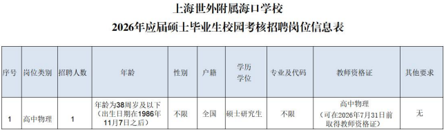 2025年海南上海世外附属海口学校面向26年应届硕士校园考核招聘教师公告(1人)